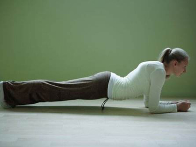 手臂和肩膀起始姿势为下犬式,前臂慢慢放下并贴到地面双脚打开,肩膀与手肘垂直,身体尽量保持呈直线状。保持正确的姿势并舒缓地呼吸5次。