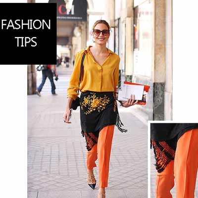 【街拍示范】:黄色衬衫+流苏围巾+橙色直筒裤+尖头高跟鞋+黑色斜挎包