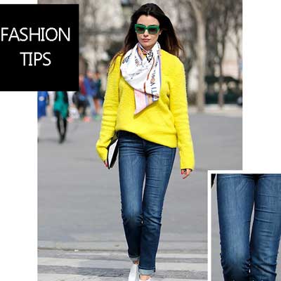 【街拍示范】:柠檬黄毛衣+蓝色牛仔裤+印花围巾+白色高跟靴+手拿包