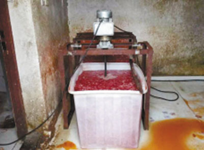 进入西侧的平房内,执法人员看到,污水遍地,且呈黄红色。地上有一个白色大塑料筐,筐内浸泡着一缕缕肉条,一台电泵带动的搅拌机正在对筐内的肉条进行搅拌。