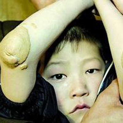 家族性高胆固醇血症:肚子像充了气的气球,鼓得厉害。在他的手臂上,长满了黄色的疙瘩,已将手关节挤压得严重变形。他的父亲李斌说,从1岁起,成成身上就开始长这些疙瘩,直到几年后,他们才知道孩子的肝脏不能分解脂肪,这些黄疙瘩就是堆积的脂肪粒。