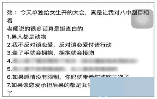 大会上,该校黄老师发表了近20分钟的讲话。“大会开完之后,我们女生私下讨论,都觉得老师的话有点偏激。”小田说,大会结束后,没有参会的男生纷纷跑来向女生打听大会内容。很快,关于该老师讲话的内容就传开了,一些学生还把老师讲话的内容进行整理,发到微博上。